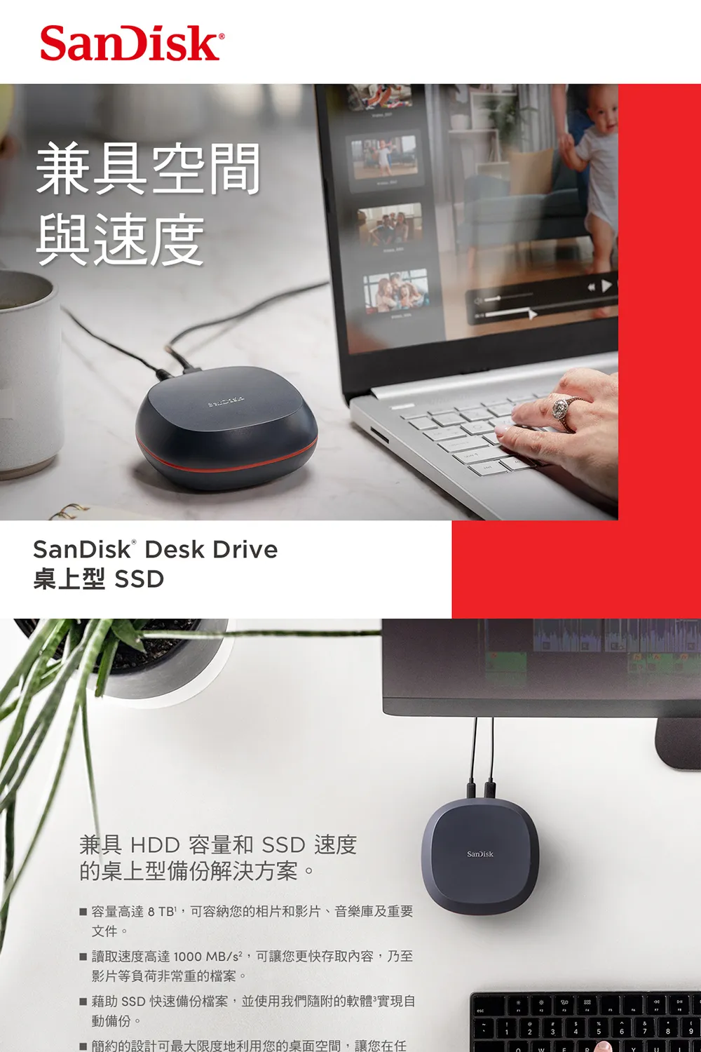 兼具空間與速度SanDisk Desk Drive桌上型 SSD兼具 HDD 容量和 SSD 速度的桌上型備份解決方案。 容量高達 8 TB,可容納您的相片和影片、音樂庫及重要文件。讀取速度高達000MB/s²,可讓您更快存取內容,乃至影片等負荷非常重的檔案。■藉助SSD快速備份檔案,並使用我們隨附的軟體實現自動備份。■簡約的設計可最大限度地利用您的桌面空間,讓您在任SanDisk2561