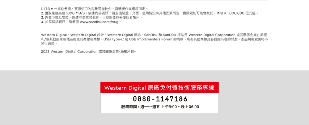 1. 1TB = 一兆位元組。實際使用的容量可能較少,具體視作業環境而定。2. 讀取速度高達 MB/S。依據內部測試視主機裝置、介面、使用情況和其他因素而定,實際效能可能會較低 = 1,000,000 位元組。3. 需要下載及安裝。需遵守條款和條件。可能需要註冊使用者帳戶。4. 如需詳細資訊,請參閱 www.sandisk.com/wug。Western Digital、Western Digital 設計、Western Digital 標誌、SanDisk 和 SanDisk 標誌 Western Digital Corporation 或其關係企業在美國和/或其他國家或地區的註冊商標或商標。USB Type-C是USB Implementers Forum 的商標。所有其他是各自擁有者的財產。產品規格變更時不另行通知。2023 Western Digital Corporation 或其關係企業。版權所有。Western Digital 原廠免付費技術服務專線0080-1147186服務時間:週一~週五上午9:00~晚上06:00