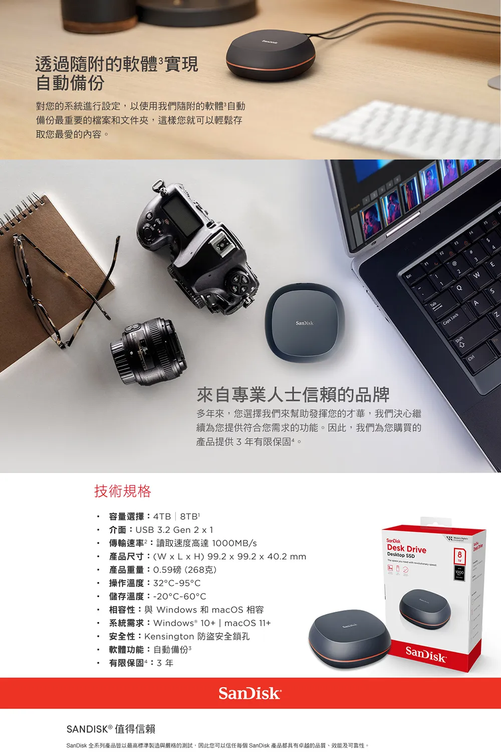 透過隨附的軟體實現自動備份對您的系統進行設定,以使用我們隨附的軟體自動備份最重要的檔案和文件夾,這樣您就可以輕鬆存取您最愛的內容aniskF3D2來自專業人士信賴的品牌多年來,您選擇我們來幫助發揮您的才華,我們決心繼續為您提供符合您需求的功能。因此,我們為您購買的產品提供3年有限保固。技術規格 容量選擇4TB 8TB介面:USB 32 Gen 2 1.傳輸速率:讀取速度高達MB/s產品尺寸:( H) 99.2 99.2 x 40.2 mm產品重量:0.59磅(268克)操作溫度:32-95儲存溫度:-20SanDiskDesk Drive8Desktop SSD相容性:與 Windows 和 macOS 相容系統需求:Windows 10+ | macOS 11+安全性:Kensington 防盜安全鎖孔SanDisk軟體功能:自動備份有限保固4:3 年SanDiskSANDISK ® 值得信賴SanDisk 全系列產品皆以最高標準製造與嚴格的測試,因此您可以信任每個 SanDisk 產品都具有卓越的品質、效能及可靠性。1000。WE LockAS