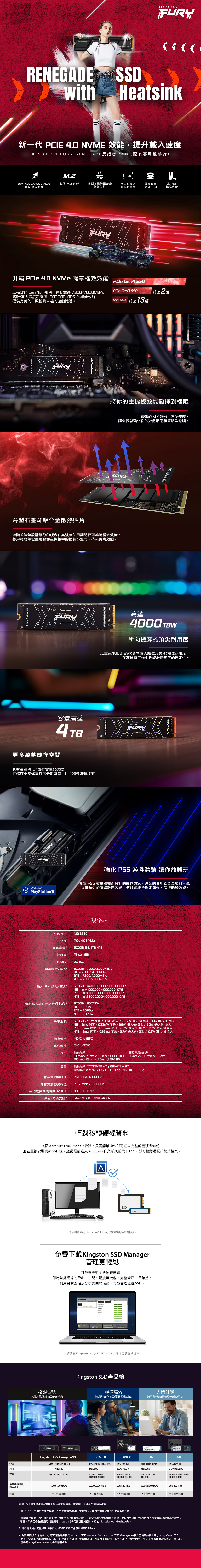 介面尺寸容量最高連續讀取寫入速度保固 FANKNGTON RENEGADEwithENEGADEDHeatink新一代 PE 4 NVME 效能提升載入速度KNGTON RENEGADE反叛者 配有專用散熱片——SSTBW高達73007000超薄 外形讀取寫入速度薄型石墨烯鋁合金散熱貼片所向披靡的儲存容量頂尖耐用度高達 40 KNGSTON.升級 4.0 暢享極致效能以極致的 44 規格達到高達7.3007000MB/讀取/寫入速度和高達 000000 的絕佳效能 提供完美的一致性及卓越的遊戲體驗Pe 4.0 M.RENEGADE薄型石墨烯鋁合金散熱貼片進階的散熱設計讓你的硬碟在高強度使用期間仍可維持穩定效能善用電競筆記型電腦和主機板中的極狹小空間帶來更高效能KNGSTONFURYRENEGADE Gen4 Pe Gen3 SATA 快上3倍快上2倍་་ 擴充容量將你的主機板效能發揮到極限纖薄的 M.2 外形方便安裝,讓你輕鬆強化你的遊戲配備和筆記型電腦。RENEGADE高達4000 TBW所向披靡的頂尖耐用度以高達資料寫入總位元數的極佳耐用度,在高負荷工作中也能維持高度的穩定性。容量高達KINGSTONFURY4 TB 更多遊戲儲存空間具有高達 4TB² 儲存容量的選擇,可儲存更多你喜愛的最新遊戲、DLC和多媒體檔案。FLFURYRENEGADEWork withPayStation 強化 遊戲體驗 讓你放膽玩專為 容量擴充而設計的儲存方案。選配的專用鋁合金散熱片能提供額外的優異散熱效果,使裝置維持穩定運作,保持巔峰效能。規格表 M.2 2280介面 I 40 NVMe儲存容量 I , . . 4TB控制器I Phison NAND 3D TLC連續讀取/寫入 7300//s7300/6,000MB/s2TB 7300/7.000MB/s4TB7300/7,000MB/s最大4K 讀取/寫入 高達450,000/900,000 ITB 高達 900,000/ 2TB 高達 / 4TB 高達 1,000,000/1,000,000 IOPS資料寫入總位元組數TBWI 500TBWITB LOPBW2TB2.0PBW4TB4.0PBW功率消耗l 500GB閒置/0.34mW平均/27W最大值讀取/4.W最大值寫入ITB5mW 閒置/033mW平均最大值)讀取/6.3W最大值)寫入2TB5mW 閒置/036mW平均/最大值)讀取/99W最大值) 寫入4TB5mW 閒置/036mW平均最大值)讀取(最大值)寫入儲存溫度I -40C 85C運作溫度 0C to 70°C尺寸 1 散熱貼片:80mm 22mm (500GB-ITB)選配專用散熱片:80mm x 267mm x 80mm x 22mm x (2TB-4TB)重量 1 散熱貼片: 500GB-ITB--4TB 選配專用散熱片: 500GB-ITB . 2TB-4TB - 34.9g作業震動尖峰值I Peak (7-800Hz)非作業震動尖峰值I Peak (20-0Hz)平均故障間隔時間 MTBF 小時保固/技術支援 15年有限保固,免費技術支援輕鬆移轉硬碟資料搭配 Acronis ® True Image 軟體,只需簡單操作即可建立完整的舊硬碟備份,並在置換安裝完新後,啟動電腦進入 Windows 作業系統前按下F11,即可輕鬆還原系統與檔案。ASSDSSD M.2*請參閱 .com/cloning 以取得更多詳細資料免費下載 Kingston SSD Manager管理更輕鬆可輕鬆更新固態硬碟韌體,即時掌握硬碟的壽命、空間、溫度等狀態,完整資訊一目瞭然。利用自我監控及分析與回報技術,有效管理監控 SSD。Kingston*請參閱 Kingston.com/SSDManager 以取得更多詳細資料Kingston SSD產品線極限電競暢速高效適用於電腦玩家及PS5玩家適用於創作者及電腦組裝玩家FURYKingston入門升級適用於傳統硬碟及一般使用者KingstonKingston FURY Renegade SSDNVMe™ Gen 4.0 x 4M.2 2280500GB, ITB, 2TB, 4TBKC3000NVMe PCIe Gen M.2 2280512GB, 1024GB,2048GB, 4096GBKC600SATA 3.02.5 / mSATA6GB, 512GB,1024GB,2048GBNV2PCle NVMeM.2 2280250GB, 500GB., 2TBA400SATA 3.02.5/ M.2 2280120GB, 240GB, 480GB,960GB. 92TB7,300/7,000 MB/S7,000/7,000 MB/s550/520 MB/s3,500/2,800 MB/S500/450 MB/s5年有限保固5年有限保固5年有限保固3年有限保固25年有限保固這款 SSD 固態硬碟適用於桌上型及筆記型電腦工作處理,不適用於伺服器環境。1. 以 PCle 4.0 主機板在原生驅動下所得的數據為基礎。實際速度可能因主機軟硬體及用途而有所不同。2儲存裝置上所列出容量有部分用於格式化和其他功能,並非全部用於資料儲存。因此,實際可用來儲存資料的儲存容量會略低於產品所標示之容量。如需更多詳細資訊,請參閱 Kingston《快閃記憶體指南》,網址:kingstoncom/flashguide。3.資料寫入總位元數 (TBW) 來自於JEDEC 客戶工作承載 )。4. 有限保固以5年為主,或是可透過應用程式 Kingston SSD Manager (Kingston.com/SSOManager) 檢視「已使用的百分比」。 以NVMe SSD而言,全新未使用過的產品,其「已使用的百分比」會顯示為0,而達到保固限制的產品,其「已使用的百分比」則會顯示大於或等於一百(100)。請參閱 Kingstoncom/wa 以取得詳細資料。