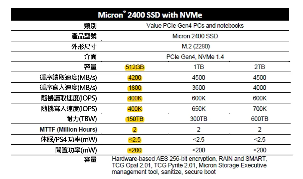 類別產品型號外形尺寸 2400 SSD with NVMeValue Gen4 PCs and notebooksMicron 2400 SSDM.2(2280)介面PCle Gen4 NVMe 1.4容量512GB1TB2TB循序讀取速度(MB/s)420045004500循序寫入速度(MB/s)180036004000隨機讀取速度(IOPS)400K600K600K隨機寫入速度(IOPS)400K650K700K耐力(TBW)150TB300TB600TBMTTF (Million Hours)222休眠/PS4 功率(W)2.52.5閒置功率(mW)200200200容量Hardware-based AES 256-bit encryption RAIN and SMART,TCG Opal 2.01, TCG Pyrite 2.01, Micron Storage Executivemanagement tool, sanitize, secure boot