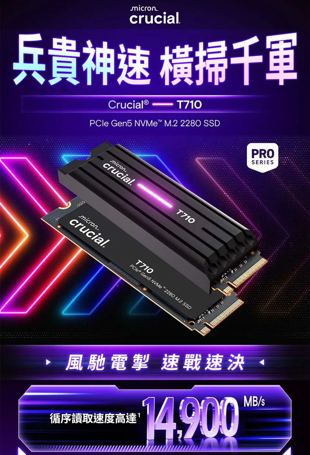 microncrucial.兵貴神速 橫掃千軍CrucialⓇ-T710PCle Gen5 NVMe M.2 2280 SSDmicron.crucial.T710micron.crucial.T710 Gen5 NVMe 2280 M.2 SSDPROSERIES風馳電掣 速戰速決循序讀取速度高達MB/s