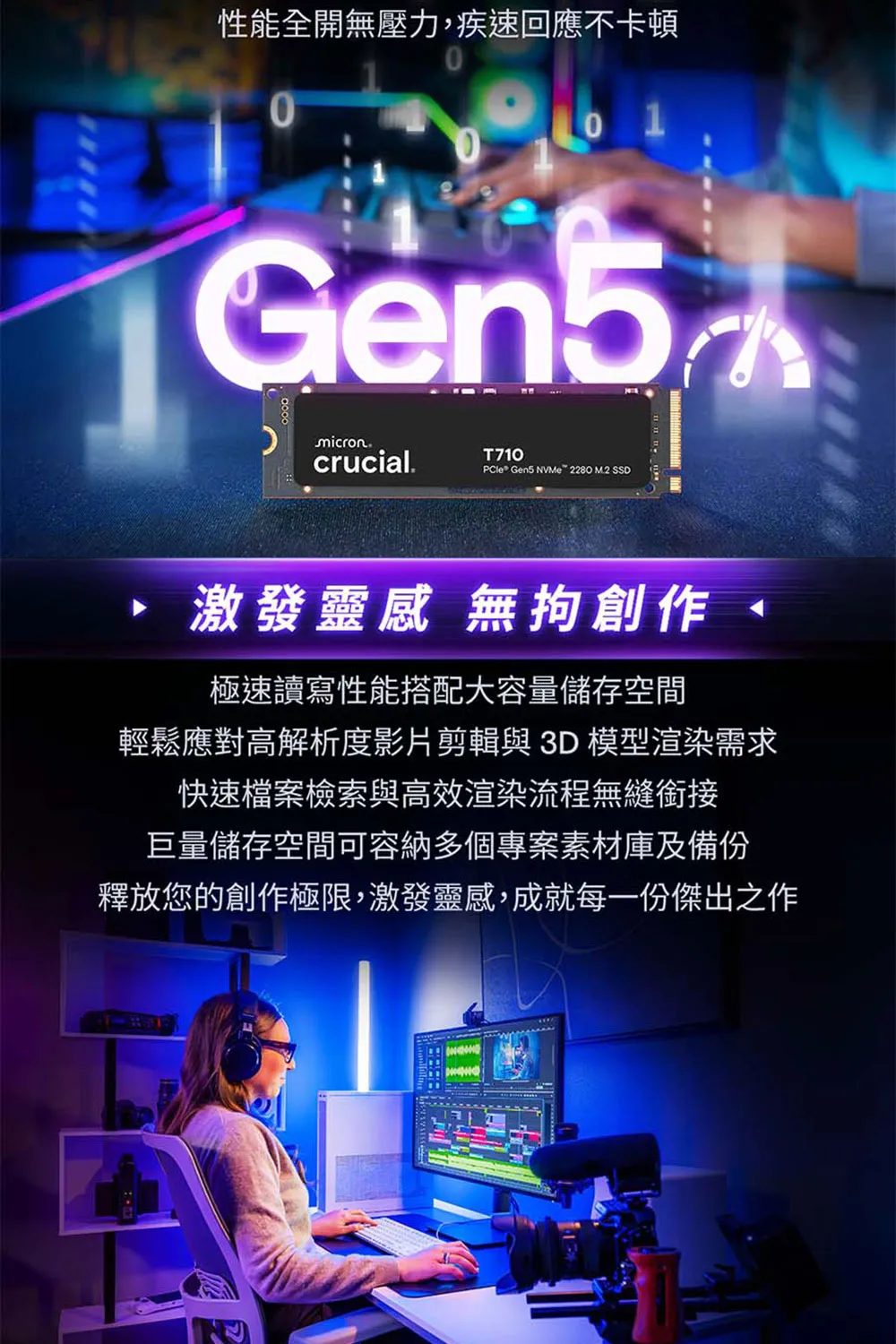 性能全開無壓力,疾速回應不卡頓Gen5microncrucial.T710 Gen5 NVMe 2280 SSD、激發靈感 無拘創作極速讀寫性能搭配大容量儲存空間輕鬆應對高解析度影片剪輯與 3D 模型渲染需求快速檔案檢索與高效渲染流程無縫銜接巨量儲存空間可容納多個專案素材庫及備份釋放您的創作極限,激發靈感,成就每一份傑出之作