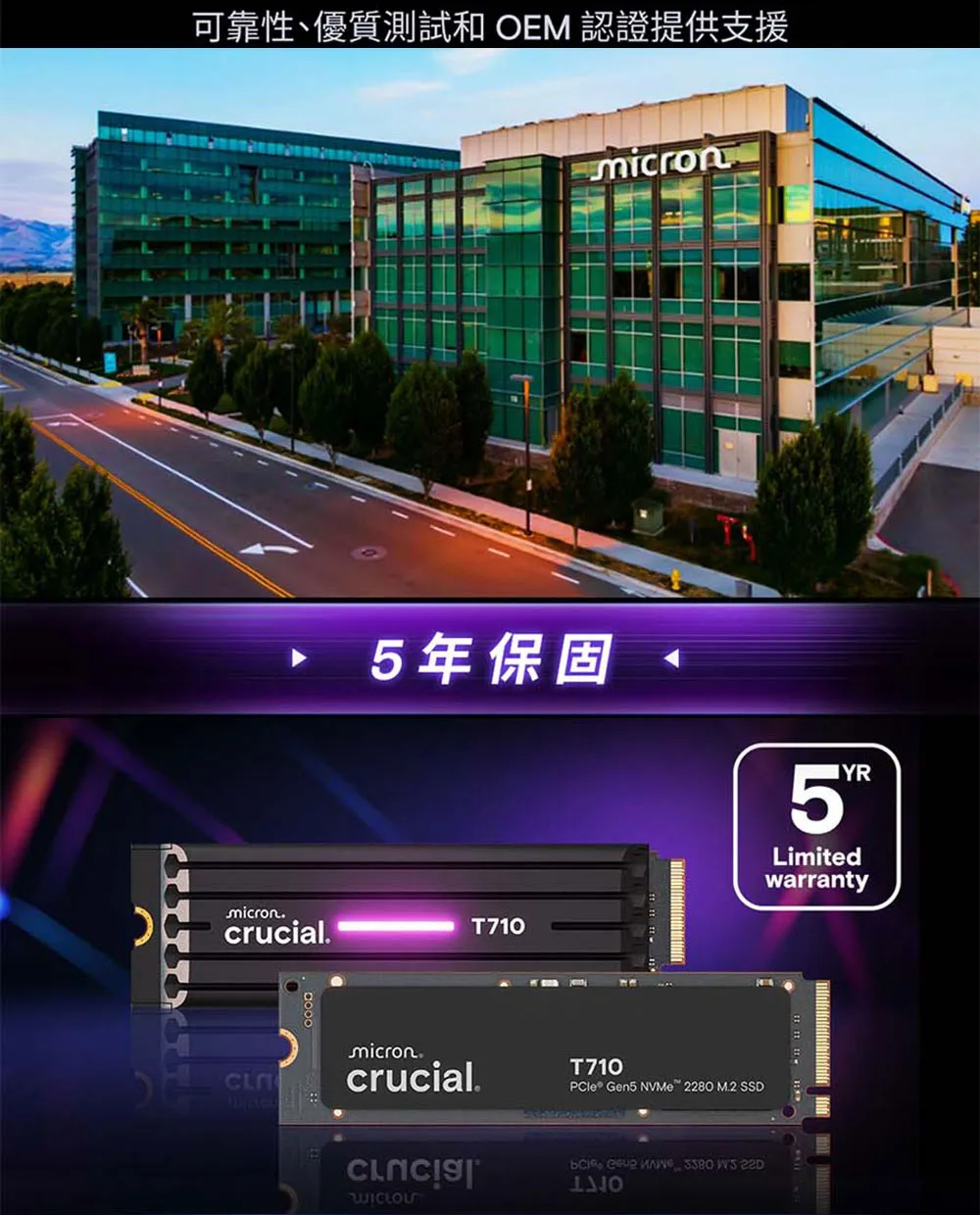 可靠性、優質測試和 認證提供支援5年保固LimitedwarrantycrucialT710micron crucial.WICLOUT710 2280 M.2 SSD