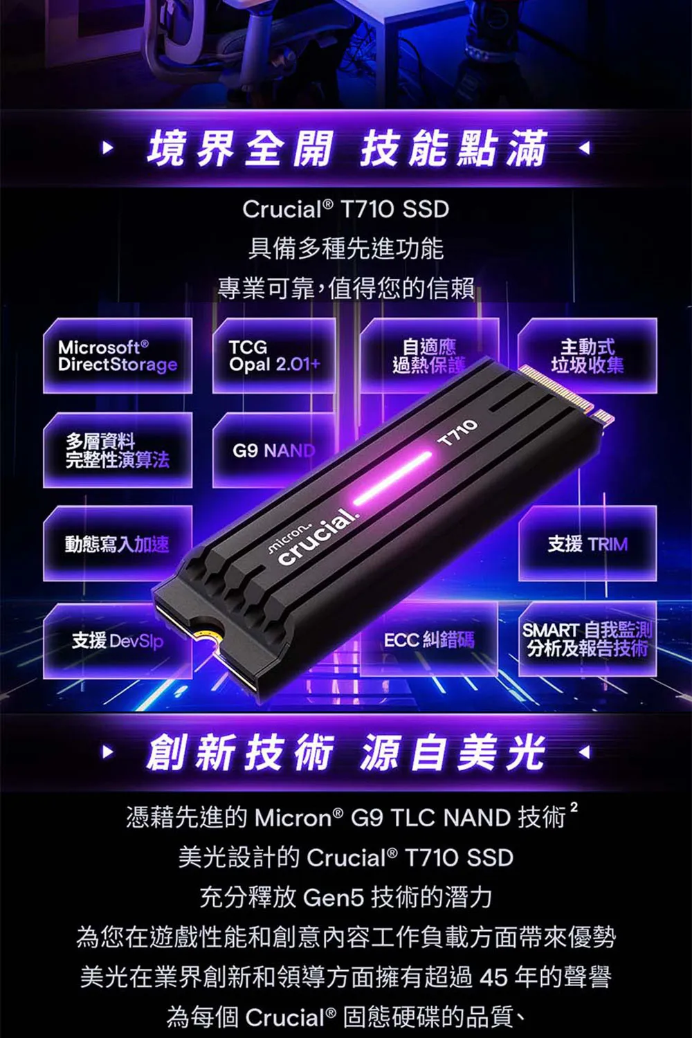 境界全開 技能點滿Crucial® T710 SSD具備多種先進功能專業可靠,值得您的信賴Microsoft®TCG自適應DirectStorageOpal 01+過熱保護主動式垃圾收集多層資料G9 NAND完整性演算法動態寫入加速支援 micron.crucial.T710支援 TRIMECC 糾錯碼 SMART 自我監測分析及報告技術創新技術 源自美光憑藉先進的 Micron® G9 TLC NAND 技術 2美光設計的 Crucial® T710 SSD充分釋放 Gen5 技術的潛力為您在遊戲性能和創意內容工作負載方面帶來優勢美光在業界創新和領導方面擁有超過45年的聲譽為每個 Crucial® 固態硬碟的品質、