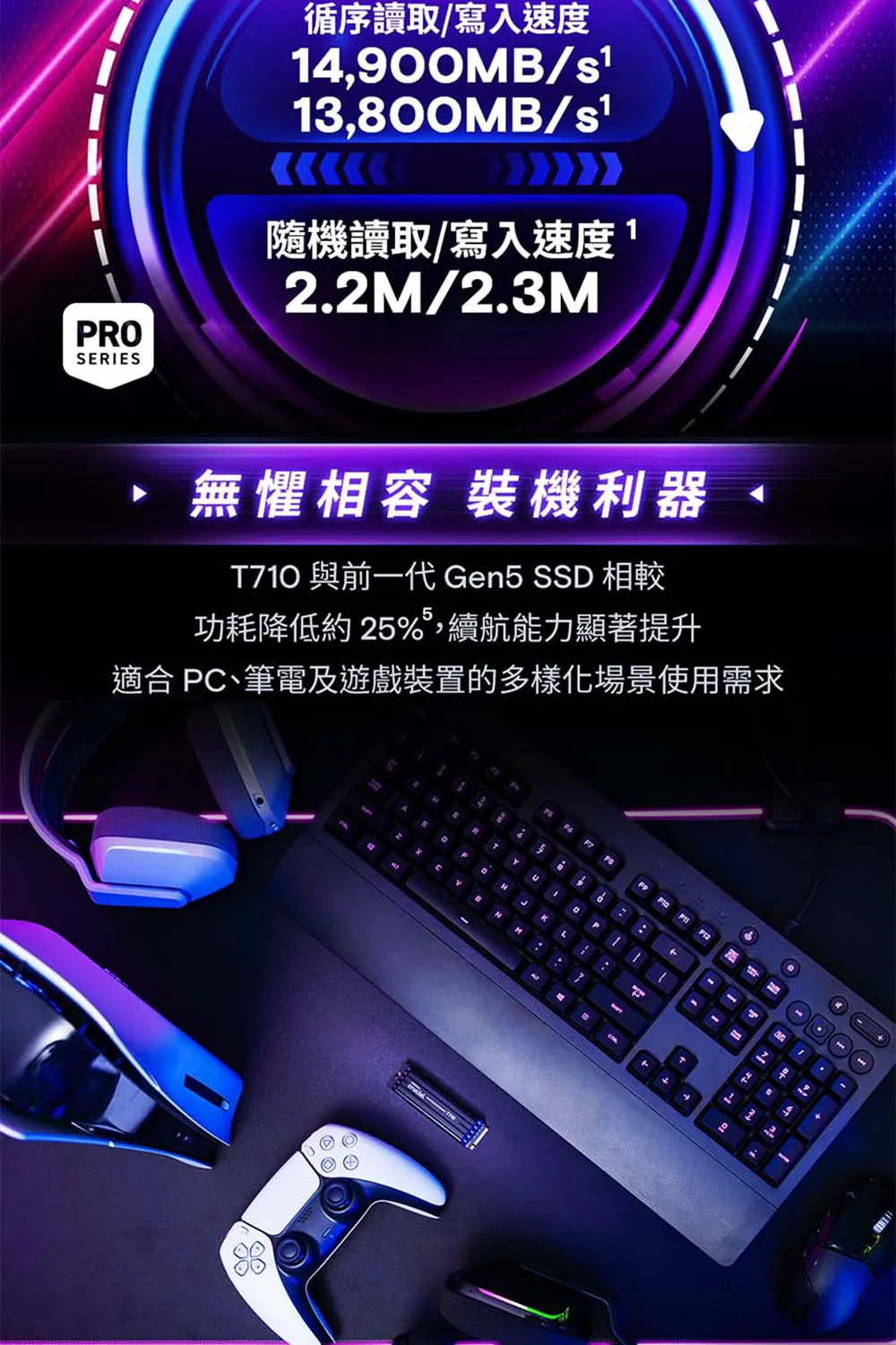 PROSERIES循序讀取/寫入速度4,900B/s1,800B/s隨機讀取/寫入速度12.2M/2.M無懼相容 裝機利器T710 與前一代 en SSD 相較功耗降低約25%,續航能力顯著提升適合 、筆電及遊戲裝置的多樣化場景使用需求A3M7F5MYLPG3