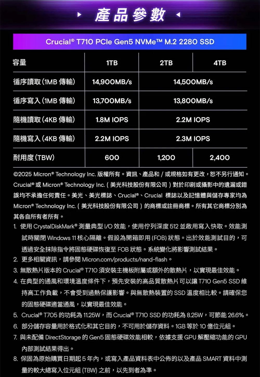 產品參數Crucial® PCle Gen5 M.2 2280 SSD容量1TB2TB循序讀取(1MB 傳輸)14,900MB/s14,500MB/s循序寫入(1MB 傳輸)13,700MB/s13,800MB/s隨機讀取(4KB傳輸)1.8M IOPS2.2M IOPS隨機寫入(4KB 傳輸)2.2M IOPS2.3M IOPS耐用度(TBW)6001,2004TB2,400©2025 Micron® Technology Inc. 版權所有。資訊產品和/或規格如有更改,恕不另行通知。Crucial® 或Micron® Technology Inc. (美光科技股份有限公司)對於印刷或攝影中的遺漏或錯誤均不承擔任何責任。美光、美光標誌、Crucial®、Crucial 標誌以及記憶體與儲存專家均為Micron® Technology Inc. (美光科技股份有限公司)的商標或註冊商標。所有其它商標分別為其各自所有者所有。1.使用 CrystalDiskMark® 測量典型I/O效能,使用佇列深度512並啟用寫入快取。效能測試時關閉 Windows 11 核心隔離。假設為開箱即用(FOB)狀態。出於效能測試目的,可透過安全抹除指令將固態硬碟恢復至FOB狀態。系統變化將影響測試結果。2. 更多相關資訊,請 Micron.com/products/nand-flash。3.無散熱片版本的 Crucial® 須安裝主機板附屬或額外的散熱片,以實現最佳效能。4. 在典型的通風和環境溫度條件下,預先安裝的高品質散熱片可以讓 Gen5 SSD維持高工作負載,不會受到過熱保護影響。與無散熱裝置的SSD 溫度相比較。請確保您的固態硬碟適當通風,以實現最佳效能。5. Crucial® T705 的功耗為11.25W,而Crucial® T710 SSD 的功耗為8.25W,可節能 26.6%。6.部分儲存容量用於格式化和其它目的,不可用於儲存資料。1GB 等於10億位元組。7. 與未配備 DirectStorage 的Gen5固態硬碟效能相較,依據支援GPU 解壓縮功能的 GPU內部測試結果得出。8.保固為原始購買日期起5年內,或寫入產品資料表中公佈的以及產品 SMART 資料中測量的較大總寫入位元組(TBW)之前,以先到者為準。