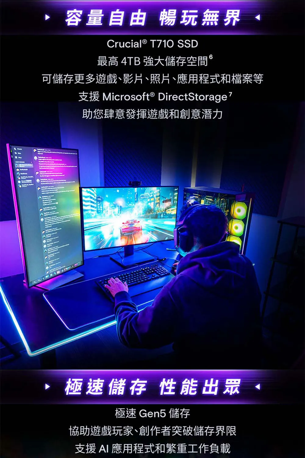 4TB 儲存空間。容量 4TB/2TB/1TBMicrosoft®DirectStorage提升遊戲體驗極速 Gen5性能出眾 極速回應支援 AI 應用程式和繁重工作負載PCle® Gen5 NVMeTMM2 220有限保固 8創新技術 源自美光5YRMicron® G9 TLC NAND 技術 25年Limitedwarrantymicron.所向披靡 制霸戰場Crucial ® T710 SSD繼承 Crucial® Pro系列產品強大、專業的基因循序讀取/寫入速度高達 14,900/13,800MB/s隨機讀取/寫入速度高達2.2M/2.3M無論是遊戲還是創作,都能帶給您風馳電掣般的效能體驗micron.crucial.T710