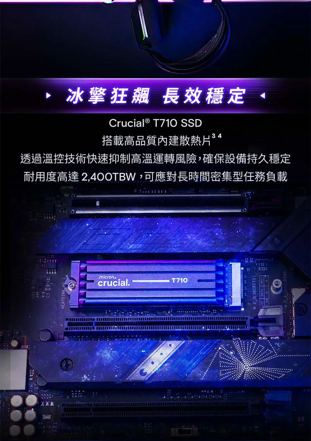 冰擎狂飆 長效穩定Crucial® T710 SSD搭載高品質內建散熱片34透過溫控技術快速抑制高溫運轉風險,確保設備持久穩定耐用度高達2,400TBW,可應對長時間密集型任務負載microncrucial.T710M.2_3(SOCKET3