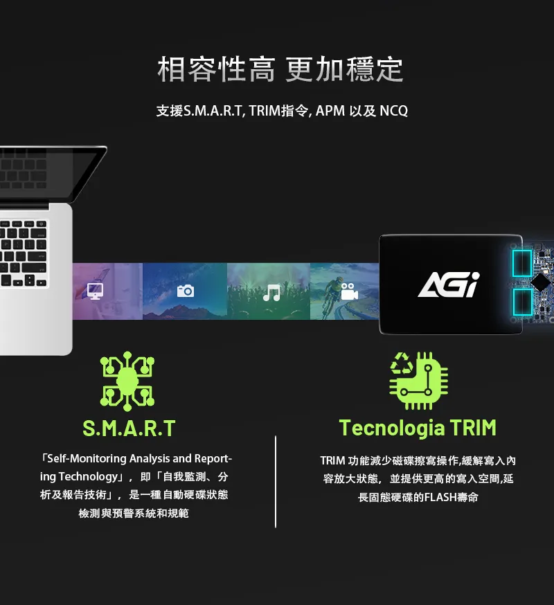 相容性高 更加穩定支援S.M.A.R.T TRIM指令, APM 以及NCQS.M.A.R.T「Self-Monitoring Analysis and Report-ing Technology」,即「自我監測、分析及報告技術」,是一種自動硬碟狀態檢測與預警系統和規範Tecnologia TRIMTRIM 功能減少磁碟擦寫操作,緩解寫入內容放大狀態,並提供更高的寫入空間,延長固態硬碟的FLASH壽命