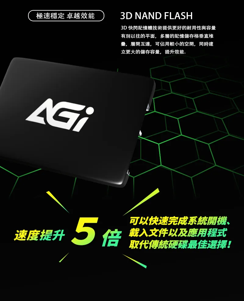 極速穩定 卓越效能3D NAND FLASH3D 快閃記憶體技術提供更好的耐用性與容量有別以往的平面,多層的記憶儲存格垂直堆疊,層間互連,可佔用較小的空間,同時建立更大的儲存容量,提升效能.速度提升5倍可以快速完成系統開機、載入文件以及應用程式取代傳統硬碟最佳選擇!