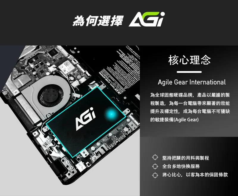 為何選擇核心理念Agile Gear International為全球固態硬碟品牌,產品以嚴謹的製程製造,為每一台電腦帶來顯著的效能提升及穩定性,成為每台電腦不可獲缺的敏捷裝備(Agile Gear)堅持把關的用料與製程全台多地快服務將心比心,以客為本的保固條款