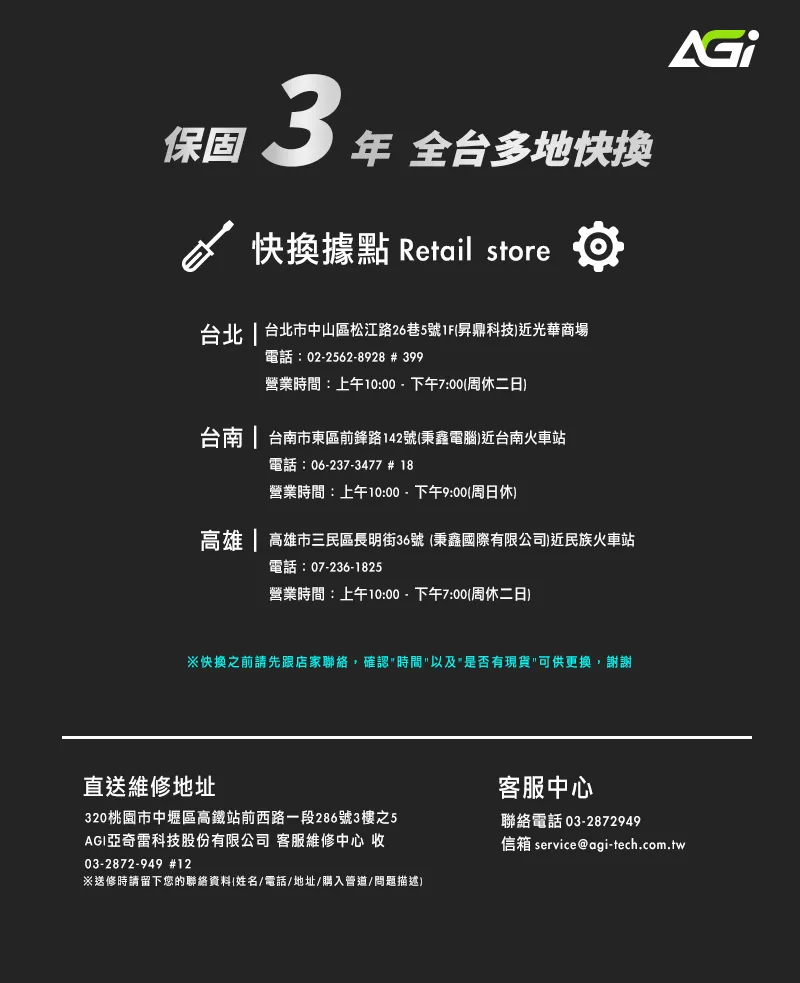 保固3 全多地快換據點 Retail store台北 台北市中山區松江路26巷5號1F昇鼎科技近光華商場電話:02-2562-8928 # 399營業時間:上午10:00-下午7:00(周休二日)台南 台南市東區前鋒路142號(秉鑫電腦)近台南火車站電話:06-237-3477 # 18營業時間:上午10:00-下午9:00(周日休)高雄 | 高雄市三民區長明街36號 (秉鑫國際有限公司)近民族火車站電話:07-236-1825營業時間:上午10:00-下午7:00(周休二日)快換之前請先跟店家聯絡,確認時間以及是否有現貨可供更換,謝謝直送維修地址320桃園市中壢區高鐵站前西路一段286號3樓之5AGI亞奇雷科技股份有限公司 客服維修中心 收03-2872-949 #12※送修時請留下您的聯絡資料(姓名/電話/地址/購入管道/問題描述)客服中心聯絡電話 03-2872949信箱 service@agi-tech.com.tw