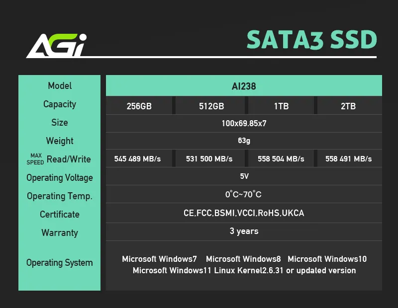 SATA3 SSDModelapacity256GB512GB1TB2TBSize10x69.85x7WeightMAXSPEEDRead/Write545 489 MB/s531 500 MB/s558 504 MB/s558 491 MB/sOperating Voltage5V070COperating Temp.CertificateWarrantyOperating SystemCEFCC BSMIVCCI UKCA3 yearsMicrosoft Windows7 Microsoft Windows8 Microsoft Windows10Microsoft Windows11 Linux Kernel2.6.31 or updated version