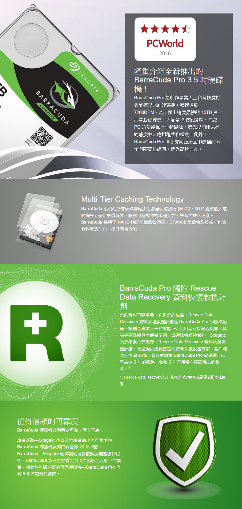 SEAGATEBARRACUDACOMPUTEBPCWorld2016隆重介紹全新推出的BarraCuda 3.5吋硬碟機!BarraCuda Pro是創作專業人士和科技愛好者夢寐以求的硬碟機,轉速達到7200RPM,為市面上速度最快的 10TB 桌上型電腦硬碟機,大容量快取記憶體,將您PC 的效能推上全新巔峰,讓您以前所未有的速度應用程式和檔案此外,BarraCuda Pro還享有同級產品中最佳的5年有限責任保固,讓您高枕無憂MultiTier Caching TechnologyBarraCuda 系列的所有硬碟機均採用快取技術 (MTC)。MTC能將個人電腦提升到全新效能境界,讓應用程式和檔案達到前所未有的載入速度。BarraCuda 採用了 NAND 快閃記憶體、DRAM 和媒體快取技術,能讓資料流最佳化,提升讀寫效能。RBarracuda ProRescueData Recovery 資料恢復劃您的資料至關重要,它是您的依靠。Rescue DataRecovery 資料恢復救計劃是 BarraCuda Pro 的標準配備,讓創意專業人士和效能PC使用者可以安心無。無論是硬碟機發生機械問題,或硬碟機意外,Seagate為您提供全面保護。 Rescue Data Recovery 資料恢復救援計劃,為您提供經驗豐富的資料恢復救援專家,客戶滿意度高達95%。您只要購買 BarraCuda Pro 硬碟機,即可享有2年的服務,整整2年不用擔心硬碟機上的資料。11. Rescue Data Recovery 資料恢復救援計劃可能需要註冊才能使用。值得信賴的可靠度BarraCuda 硬碟機系列穩定可靠,歷久不衰。專業經驗—Seagate 生產及供應具備出色可靠度的BarraCuda 硬碟機系列已有長達20 年時間。Barracuda-Seagate 硬碟機的可靠度數據無需多作說明,BarraCuda 系列更經常受到頂尖出版品及客戶的讚賞。讓您無後顧之憂的可靠硬碟機—BarraCuda Pro 有5年有限責任保固。