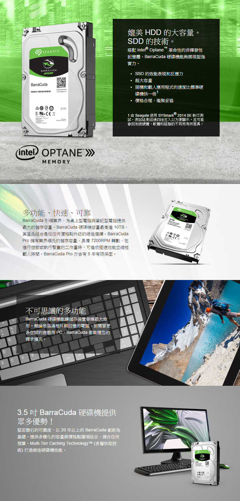 媲美 HDD 的大容量SDD 的技術搭配 Intel® Optane 革命性的非揮發性記憶體BarraCuda 硬碟機能夠展現堅強BARRACUDABarraCuda實力SSD 的效能表現和反應力超大容量開機和載入應用程式的速度比標準硬碟機快一倍價格合理,毫無妥協intel OPTAEMEMORY1 由 Seagate 使用 SYSmark 21 SE 執行測試。測試結果經過四捨五入以方便顯示,且可能會因系統硬體軟體和組態的不同而有所差異。多功能、快速、可靠BarraCuda 引領業界,為桌上型電腦與筆記型電腦提供最大的儲存容量。BarraCuda 硬碟機容量最高達 10TB,其產品組合是從任何價格點升級的絕佳選擇。BarracudaPro 擁有業界領先的儲存容量,具備 7200RPM 轉數,在進行遊戲或執行繁重的工作量時,可達成極速效能並縮短載入時間。Barracuda Pro 亦5年有限保固。79不可思議的多功能+%45R需求擴充。DFGH多空間的遊戲用 PC,BarraCuda 都能您的BarraCuda 硬碟機能讓儲存裝置發揮最大效用。無論是裝滿相片與回憶的電腦,到需要更CBNM3.5 BarraCuda 硬碟機提供眾多優勢!堅若磐石的可靠度,以20年以上的 BarraCuda 創新為基礎。提供多樣化的容量與價格點選項組合,適合任何預算。Multi-Tier Caching Technology™ (快取技術)打造絕佳硬碟機效能。0 SEAGATE