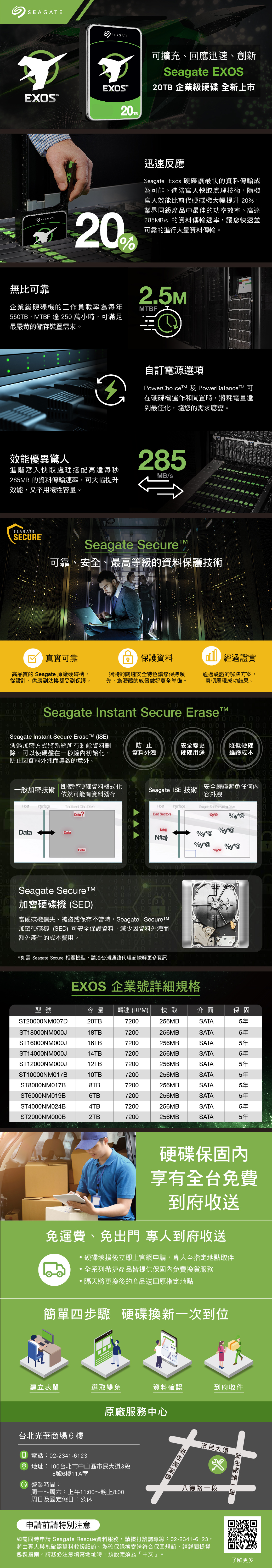 EXOSSEAGATESECURE無比可靠企業級硬碟機工作負載率為每年55TB,MTBF 25 萬小時,可滿足最嚴苛的儲存裝置需求SEAGATE效能優異驚人進階寫入快取處理搭配高達每秒285MB 的資料傳輸速率,可大幅提升效能,又不用犧牲容量。真實可靠高品質的 Seagate 原廠硬碟機,從設計、供應到汰換都受到保護。Data般加密技術Seagate Instant Secure EraseTM (ISE) 透過加密方式將系統所有剩餘資料刪除,可以使硬盤在一秒鐘初始化,防止因資料外洩而導致的意外。 營業型號ST20NM007DST000NM017BST8000NM017BST6000NM019BST4000NM024BST2000NM000B建立表單申Seagate Secure加密硬碟機 (SED)如需同請時20周日及Seagate Secure可靠、安全、最高等級的資料保護技術Traditional Disc DriveData台北光華商場6樓時間:Seagate Instant Secure Erase00000 電話:022341-6123 地址:0台北8號6樓11A室即使將硬碟資料格式化。依然可能有資料殘存周一~周六:上申DataDataSEAGATEEXOS包裝指。請務必20 TB注當硬碟機遺失、被盜或保存不當時,Seagate SecureTM加密硬碟機(SED) 可安全保護資料,減少因資料外洩而010額外產生的成本費用。如需 Seagate Secure 相關機型,請洽台灣通路代理商瞭解更多資訊容量18TB16TB14TB12TB10TB8TB6TB4TB2TB午11前請特別注意國定假日:公休可擴充、回應迅速、創新Seagate EXOS20TB 企業級硬碟 全新上市迅速反應Seagate Exos 硬碟讓最快的資料傳輸成為可能。進階寫入快取處理技術,隨機寫入效能比前代硬碟機大幅提升 20,業界同級產品中最佳的功率效率。高達285MB/s 的資料傳輸速率,讓您快速並可靠的進行大量資料傳輸。 保護資料獨特的關鍵安全特色讓您保持領先,為潛藏的威脅做好萬全準備。25MMTBF選取雙免市中山區市民大道3段自電源選項 PowerBalance 在硬碟機運作和閒置時,將耗電量達到最佳化,隨您的需求應變。285MB/s:00~晚上8:00防止資料外洩EXOS 企業號詳細規格轉速 (RPM) 快取7200256MB7200256MB7200256MB7200256MB7200256MB7200256MB7200256MB7200256MB7200256MB7200256MBSeagate ISE 技術0101001001Host Bad SectorsN#a}0000簡單四步驟 硬碟換新一次到位安全嚴謹避免任何內容外洩 10Seagate -Encrypting Drive.安全變更硬碟用途免運費、免出門 專人到府收送硬碟壞損後立即上官網申請,專人至指定地點取件的全系列希捷產品皆提供保固內免費換貨服務隔天將更換後的產品送回原指定地點原廠服務中心經過證實通過驗證的解決方案,真切展現成功結果。資料確認文」。Seagate Rescue資料服請務,請撥打諮詢專線:02-2341-6123,將由專人與您確認資料救援確保退送符合保固規範,請詳閱提貨細節。為 換寄填寫地址 時,預設定須 為「意中TM介面SATASATASATASATASATASATASATASATASATASATA硬碟保固內享有全台免費到府收送降低硬碟維護成本*@八德路一段@%y*@市民大道0 100 10到府收件保固5年5年5年5年5年5年5年5年5年5年南路一了解更多