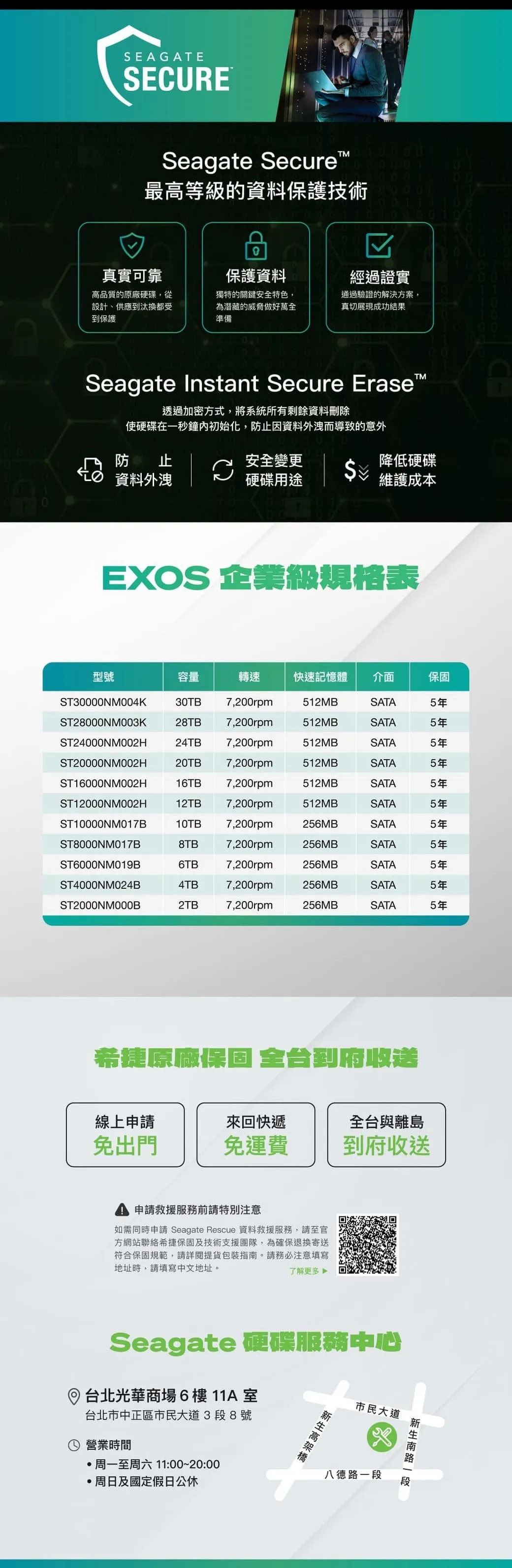 SEAGATESECURESeagate SecureTM最高等級的資料保護技術 00真實可靠保護資料經過證實高品質的原廠硬碟,從設計、供應到汰換都受到保護獨特的關鍵安全特色,為潛藏的威脅做好萬全準備通過驗證的解決方案,真切展現成功結果00Seagate Instant Secure Erase透過加密方式,將系統所有剩餘資料刪除使硬碟在一秒鐘內初始化,止因資料外洩而導致的意外TM 防止 資料外洩安全變更硬碟用途降低硬碟維護成本EXOS 企業級規格表型號容量轉速快速記憶體介面保固ST30000NM004K30TB 7,200rpm12MBSATA5ST28000NM003K28TB 7,200rpm512MBSATA5年ST24000NM002H24TB 7,200rpm512MBSATA5年ST20000NM002H20TB 7,200rpm512MBSATA5年ST16000NM002H16TB 7,200rpm512MBSATA5年ST12000NM002H12TB 7,200rpm512MBSATA5年ST10000NM017B10TB 7,200rpm256MBSATA5年ST8000NM017B8TB7,200rpm256MBSATA5年ST6000NM019B6TB7,200rpm256MBSATA5年ST4000NM024B4TB7,200rpm256MBSATA5年ST2000NM000B2TB7,200rpm256MBSATA5年希捷原廠保固 全到府收送線上申請來回快遞全台與離島免出門免運費到府收送申請服務前請特別注意如需同時申請 Seagate Rescue 資料救援服務,請至官方網站聯絡希捷保固及技術支援團隊,為確保退換寄送符合保固規範,請詳閱提貨包裝指南。請務必注意填寫地址時,請填寫中文地址。了解更多 Seagate 硬碟服務中心台北光華商場6樓11A室台北市中正區市民大道3段8號市民大道營業時間·周一至周六11:00~20:00周日及國定假日公休八德路南路一段