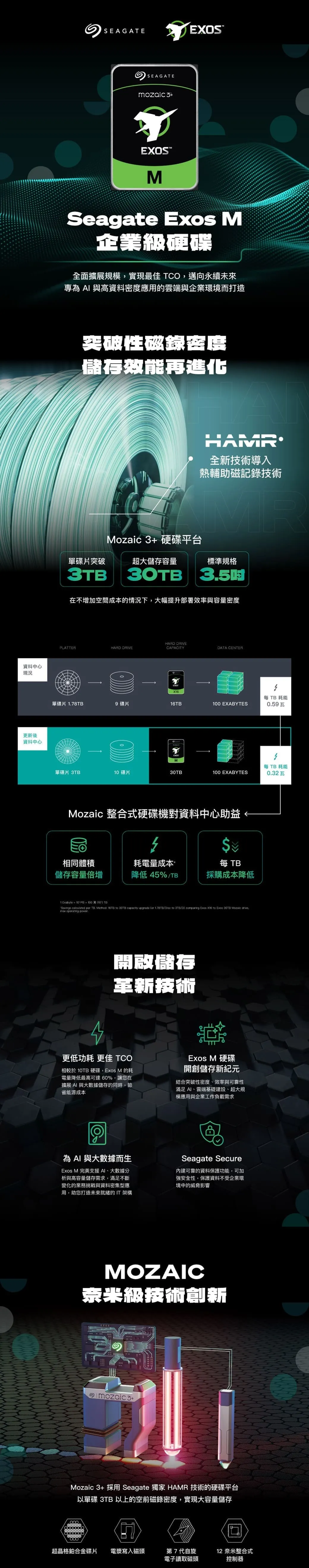 資料中心現況更新後資料中心SEAGATEEXOSSEAGATEmozaic EXOSMSeagate M企業級硬碟全面擴展規模實現最佳 TCO,邁向永續未來專為 與高資料密度應用的雲端與企業環境而打造突破性磁錄密度儲存效能再進化 3+ 硬碟平台全新技術導入熱輔助磁記錄技術單碟片突破超大儲存容量標準規格3 30TB 35在不增加空間成本的情況下,大幅提升部署效率與容量密度HARD DRIVEPLATTERHARD DRIVECAPACITYDATA CENTER TB 耗能單碟片 178TB9 碟片16TB100 EXABYTES059瓦M每 TB 耗能單碟片 3TB10 碟片30TB100 EXABYTES0.32 瓦Mozaic 整合式硬碟機對資料中心助益相同體積耗電量成本每 TB儲存容量倍增降低 5%/TB採購成本降低1 Exabyte 10 PB 100 10 TBSavings calculated TB. Method: 16TB to 30TB capacity upgrade (or 1.78TB/ to 3TB/ comparing Exos X16 to 30TB Mozaic . operating power.4開啟儲存革新技術更低功耗 更佳 TCO相較於 10TB 硬碟,Exos M 的耗電量降低最高可達60%,讓您在擴展 AI 與大數據儲存的同時,節省能源成本Exos M 硬碟開創儲存新紀元結合突破性密度、效率與可靠性滿足 AI、雲端基礎建設、超大規模應用與企業工作負載需求為AI與大數據而生Exos M 完美支援AI、大數據分析與高容量儲存需求,滿足不斷變化的業務挑戰與資料密集型應用,助您打造未來就緒的IT架構Seagate Secure內建可靠的資料保護功能,可加強安全性,保護資料不受企業環境中的威脅影響MOZAIC奈米級技術創新mozaic 3+Mozaic 3+ 採用 Seagate 獨家 HAMR 技術的硬碟平台以單碟 3TB 以上的空前磁錄密度,實現大容量儲存超晶格鉑合金碟片 電漿寫入磁頭第7代自旋12奈米整合式電子讀取磁頭控制器