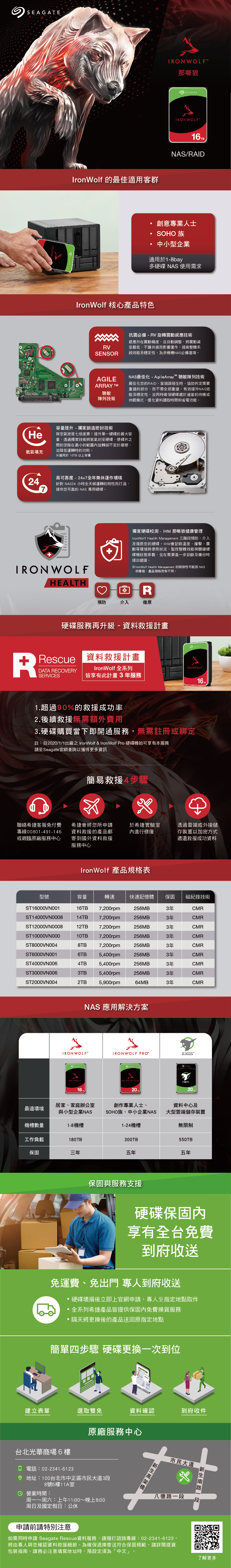 GAEIronWolf 的最佳適用客群RN那嘶O SEAGAEIRON WOLF16TBNAS/RAID創意專業人士 SOHO族中小型企業適用於1bay多硬碟 NAS 使用需求IronWolf 核心產品特色RVSENSOR抗震必備-RV 旋轉震動感應技術感應外在震動幅度,並自動調整,將震動減至最低,不讓共振而影響運作,提高整體系統效能及穩定性,為多機槽NAS必備選項。AGILEARRAY 聰敏陣列技術NAS最佳化 - AgileArray 聰敏陣列技術最佳化您的RAID、當錯誤發生時,協助判定需要重建的部分,而不需全部重建,有效提升NAS效能及穩定性,並同時確保硬碟處於適當的待機或休眠模式,優化資料讀取時間和省電功能。He容量提升-獨家鍛造密技術與空氣密度七倍差異!提升單一硬碟的最大容量,透過獨家技術將氦氣封至硬碟,使碟片間的空隙在最小的範圍旋轉卻不至於摩擦,氮氣填充並降低運轉時的功耗。※適用於 10TB 以上容量247高可靠度-247全年無休運作環境針對 NAS24 小時全天候運轉的特性而打造,提供您可靠的 NAS 專用硬碟。HEALTH獨家硬碟校測- IHM 那嘶狼健康管理IronWolf Health Management 三階段預防、介入及復原您的硬碟。IHM會記錄溫度、撞擊、震動等環境與使用狀況,監控整體效能與關鍵硬碟機狀態參數,並在需要進一步診斷及備份時提出建議。※ IronWolf Health Management 的相容性可能因 NAS供應商、產品規格而有不同。R預防介入復原硬碟服務再升級-資料救援計畫Rescue 資料救援計畫RIronWolf 全系列FDATA RECOVERY皆享有此計畫3年服務16TBSERVICES1.超過90%的救援成功率2.後續救援無需額外費用3.硬碟購買當下即開通服務,無需註冊或綁定註:自2020/1/1之 IronWolf & IronWolf Pro 硬碟機始可享有本服務請至Seagate官網查詢以獲得更多資訊簡易救援4步驟x8聯絡希捷客服免付費專線00801-491-146或親臨原廠服務中心希捷會將您所申請資料救援的產品郵寄到國外資料救援服務中心於希捷實驗室內進行修復IronWolf 產品規格表透過雲端或外接儲存裝置以加密方式遞還救援成功資料型號容量轉速快速記憶體保固磁紀錄技術ST16000VN001ST14000VN000816TB 7,200rpm14TB 7,200rpm256MB3年CMR256MB3年CMRST12000VN0008ST8000VN004ST6000VN001ST4000VN006ST3000VN006ST2000VN00412TB 7,200rpm10TB 7,200rpm8TB 7,200rpm6TB 5,400rpm4TB 5,400rpm3TB 5,400rpm2TB 5,900rpm256MB3年CMR256MB3年CMR256MB3年CMR256MBT256MB256MB T3年CMR3年CMR3年CMR64MB T3年CMRNAS 應用解決方案IRON WOLFIRON WOLF EXOS™SEA TRONWOL16IRONWOLF PROEXOS2020最適環境居家、家庭辦公室與小型企業NAS創作專業人士、資料中心及SOHO族、中小企業NAS大型雲端儲存裝置機槽數量1-8機槽1-24機槽無限制工作負載180TB300TB550TB保固三年五年五年保固與服務支援硬碟保固內享有全台免費到府收送免運費、免出門 專人到府收送硬碟壞損後立即上官網申請,專人至指定地點取件全系列希捷產品皆提供保固內免費換貨服務隔天將更換後的產品送回原指定地點簡單四步驟 硬碟更換一次到位建立表單選取雙免資料確認到府收件台北光華商場6樓 電話:02-2341-6123原廠服務中心 地址:100台北市中正區市民大道3段8號6樓11A室 營業時間:周一~周六:上午11:00~晚上8:00周日及國定假日:公休市民大道八德路一段申請前請特別注意如需同時申請 Seagate Rescue資料服務,請撥打諮詢專線:02-2341-6123,將由專人與您確認資料救援細節。為確保退換寄送符合保固規範,請詳閱提貨包裝指南。請務必注意填寫地址時,預設定須為「中文」。了解更多