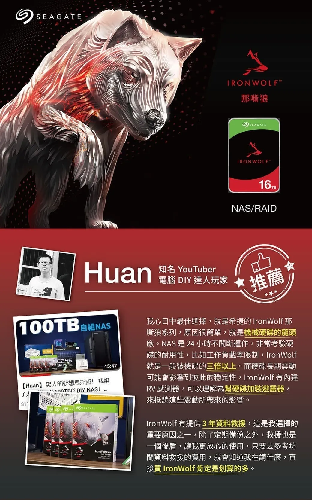 TRONWOLF那嘶狼SEAGATE16TBNAS/RAIDHuan100TB 自NASC24645:47【Huan】男人的夢想烏托邦! 我 NAS!311SEAGATE Pro知名 YouTuber電腦 DIY 達人玩家推薦我心目中最佳選擇,就是希捷的 IronWolf 那嘶狼系列,原因很簡單,就是機械硬碟的龍頭廠。NAS是24小時不間斷運作,非常考驗硬碟的耐用性,比如工作負載率限制,IronWolf就是一般裝機碟的三倍以上。而硬碟長期震動可能會影響到彼此的穩定性,IronWolf 有內建RV 感測器,可以理解為幫硬碟加裝避震器,來抵銷這些震動所帶來的影響。IronWolf 有提供3年資料救援,這是我選擇的重要原因之一,除了定期備份之外,救援也是一個後盾,讓我更放心的使用,只要去參考坊間資料救援的費用,就會知道我在講什麼,直接買 IronWolf 肯定是划算的多。