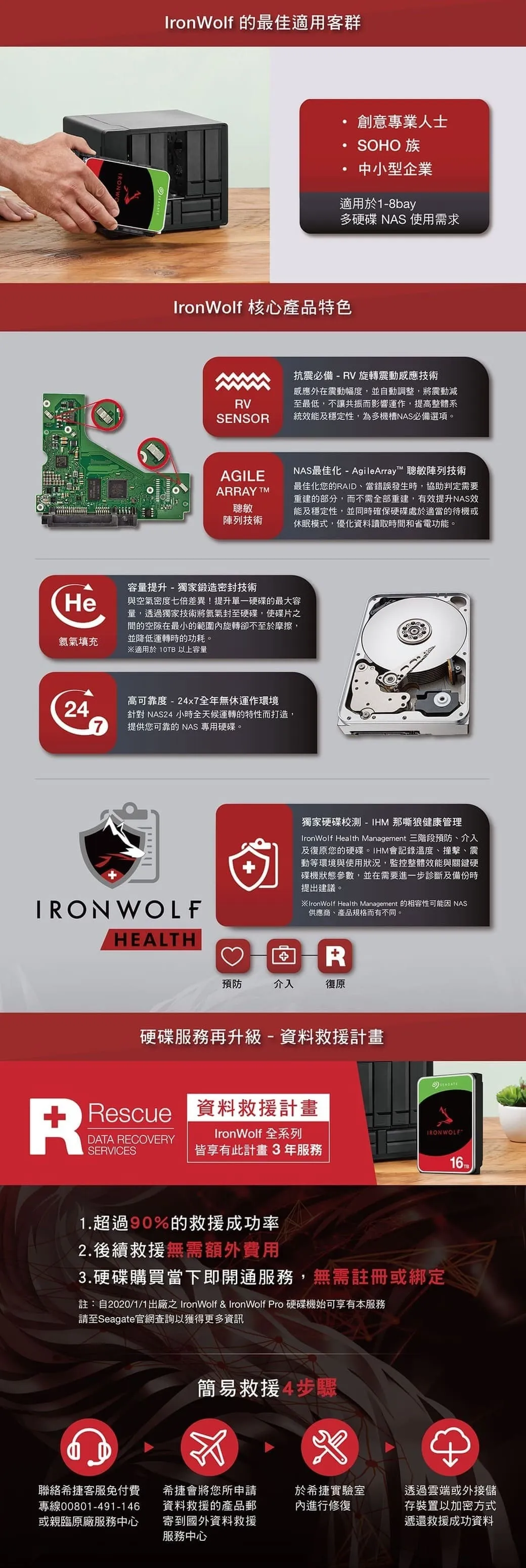 IronWolf 的最佳適用客群創意專業人士·SOO族中小型企業適用於1-8bay多硬碟 NAS 使用需求IronWolf 核心產品特色RVSENSOR抗震必備-RV旋轉震動感應技術感應外在震動幅度,並自動調整,將震動減至最低,不讓共振而影響運作,提高整體系統效能及穩定性,為多機槽NAS必備選項。AGILEARRAY 陣列技術NAS最佳化-AgileArray™ 聰敏陣列技術最佳化您的RAID、當錯誤發生時,協助判定需要重建的部分,而不需全部重建,有效提升NAS效能及穩定性,並同時確保硬碟處於適當的待機或休眠模式,優化資料讀取時間和省電功能。容量提升-獨家鍛造密封技術與空氣密度七倍差異!提升單一硬碟的最大容量,透過獨家技術將氦氣封至硬碟,使碟片間的空隙在最小的範圍內旋轉卻不至於摩擦,He氦氣填充並降低運轉時的功耗。適用於 10TB 以上容量高可靠度-24x7全年無休運作環境247針對 NAS24 小時全天候運轉的特性而打造,提供您可靠的 NAS 專用硬碟。TRONWOLFHEALTH獨家硬碟校測- IHM 那嘶狼健康管理IronWolf Health Management 三階段預防、介入及復原您的硬碟。IHM會記錄溫度、撞擊、震動等環境與使用狀況,監控整體效能與關鍵硬碟機狀態參數,並在需要進一步診斷及備份時提出建議。※ IronWolf Health Management 的相容性可能因 NAS供應商、產品規格而有不同。R預防介入復原硬碟服務再升級-資料救援計畫RH Rescue 資料救援計畫DATA RECOVERYIronWolf 全系列TRON WOLFSERVICES皆享有此計劃3年服務1.超過90%的救援成功率2.後續救援無需額外費用3.硬碟購買當下即開通服務,無需註冊或綁定註:自2020/1/1出廠之 IronWolf & IronWolf Pro 硬碟機始可享有本服務請至Seagate官網查詢以獲得更多資訊簡易救援4步驟聯絡希捷客服免付費專線00801-491-146或親臨原廠服務中心希捷會將您所申請資料救援的產品郵寄到國外資料救援服務中心於希捷實驗室內進行修復16TB透過雲端或外接儲存裝置以加密方式遞還救援成功資料