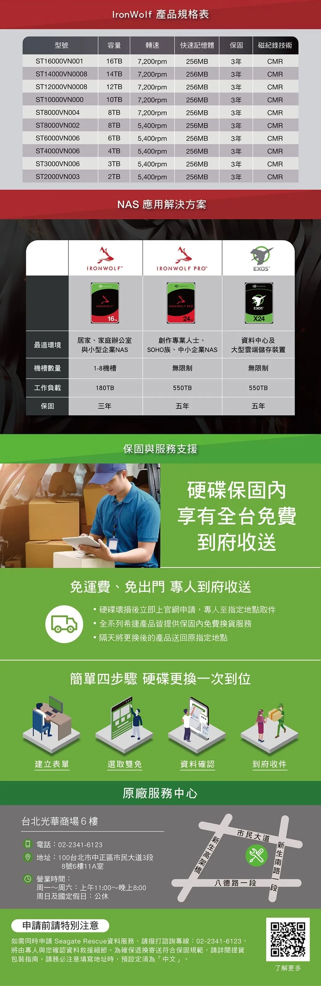 IronWolf 產品規格表型號容量轉速快速記憶體保固磁紀錄技術S16000VN00116TB 7,200rpm256BM3年CMRST14000VN000814TB 7,200rpm256MB3年CMRST12000VN000812TB 7,200rpm256MB3年CMRST10000VN00010TB 7,200rpm256MB3年CMRST8000VN0048TB 7,200rpm256MB3年CMRST8000VN0028TB5,400rpm256MB3年CMRST6000VN0066TB5,400rpm256MB3年CMRST4000VN0064TB5,400rpm256MB3年CMRST3000VN0063TB®5,400rpm256MB3年CMRST2000VN0032TB 5,400rpm256MBT3年CMRNAS 應用解決方案IRON WOLF- PROEXOS16IRONWOLF PROEXOSX24最適環境居家、家庭辦公室與小型企業NAS創作專業人士、SOHO族、中小企業NAS資料中心及大型雲端儲存裝置機槽數量1-8機槽無限制無限制工作負載180TB550TB550TB保固三年五年五年保固與服務支援硬碟保固內享有全台免費到府收送免運費、免出門 專人到府收送硬碟壞損後立即上官網申請,專人至指定地點取件全系列希捷產品皆提供保固內免費換貨服務隔天將更換後的產品送回原指定地點簡單四步驟 硬碟更換一次到位建立表單選取雙免資料確認到府收件原廠服務中心台北光華商場6樓 電話:02-2341-6123 地址:100台北市中正區市民大道3段8號6樓11A室 營業時間:周一~周六:上午11:00~晚上8:00周日及國定假日:公休市民大道八德路一段申請前請特別注意如需同時申請 Seagate Rescue資料服務,請撥打諮詢專線:02-2341-6123,將由專人與您確認資料救援細節。為確保退換寄送符合保固規範,請詳閱提貨包裝指南。請務必注意填寫地址時,預設定須為「中文」了解更多