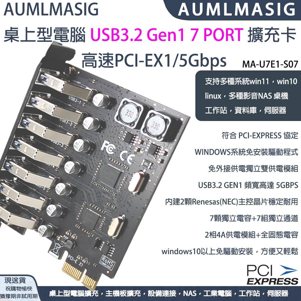 AUMLMASIG【MA-U7-PX1RA-S】7 PORT USB 3.0 擴充卡/電腦主機板擴充卡PCI-E TO USB 3.0 擴充卡 高速 7 PORT 電腦主機板後置擴充卡七相獨立供電模組,雙核心瑞薩科技晶片,USB控制NEC晶片原裝正品(3年有限質保)
