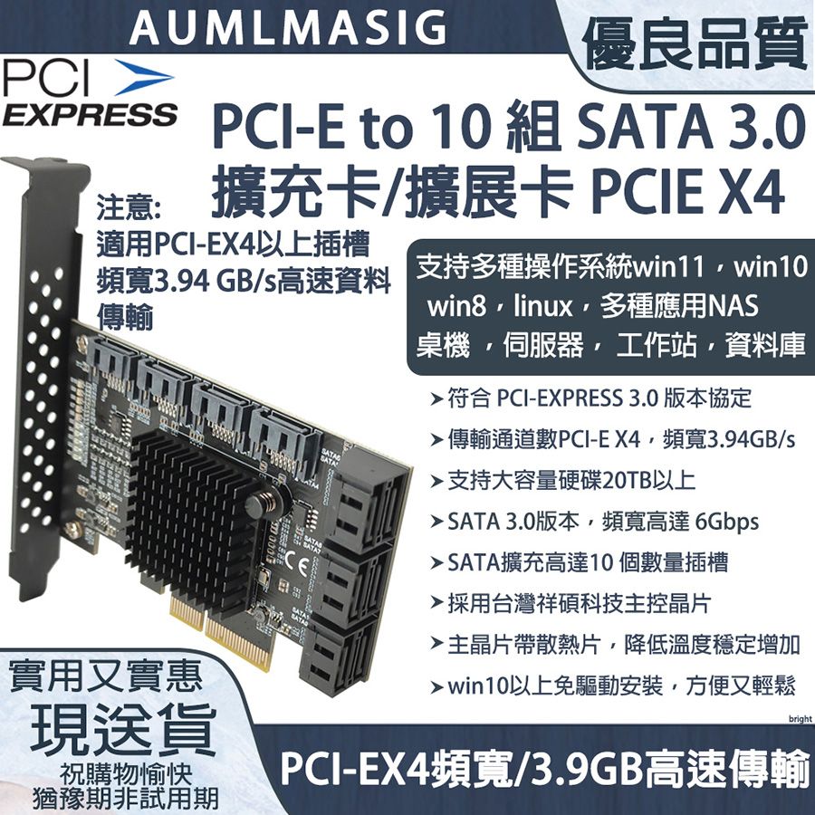 【AUMLMASIG全通碩】10 PORT SATA 3.0擴充卡 PCI-E3.0X4/(3年有限保固●祥碩控制晶片穩定/帶散熱片桌上型電腦/NAS/伺服器/工作站/資料庫●支持大容量硬碟30TB,支援軟體作業系統RAID,支持win10作業系統免驅動使用